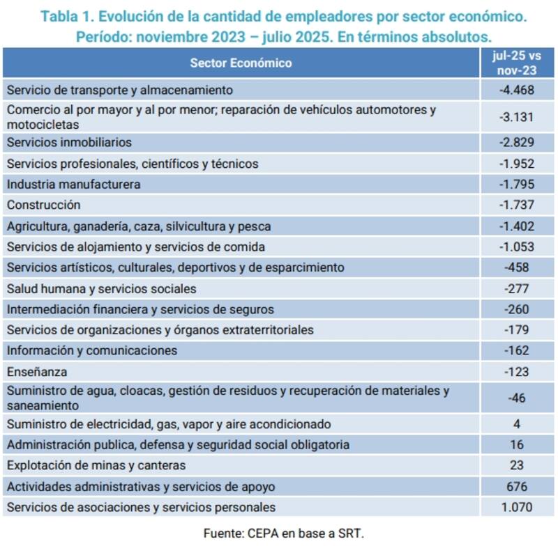 Entre los sectores más afectados se destacó el de Transporte y Almacenamiento, con una pérdida de 4.468 empleadores entre noviembre de 2023 y julio de 2025.