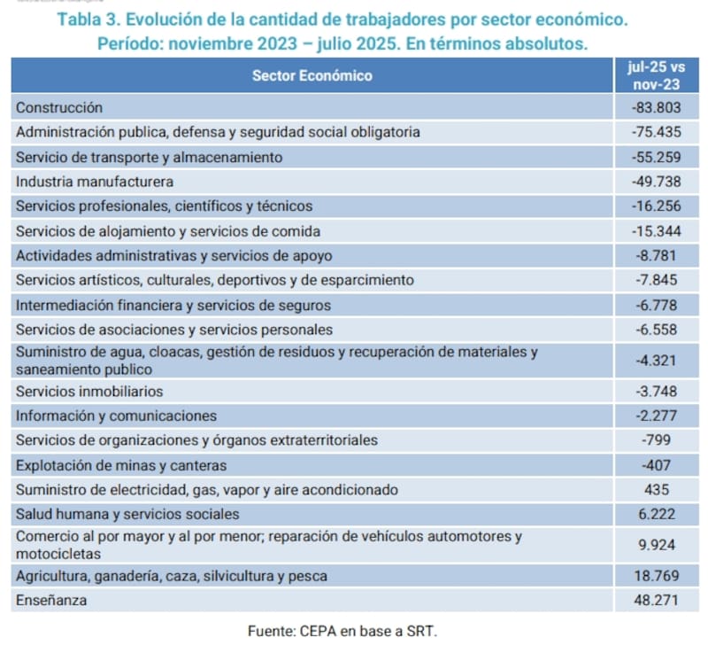 Un informe que analiza datos de la Superintendencia de Riesgos del Trabajo (SRT) revela una contracción "significativa" de 18.083 empleadores y 253.728 puestos registrados desde que Javier Milei fue elegido Presidente de la Argentina hasta julio de 2025.