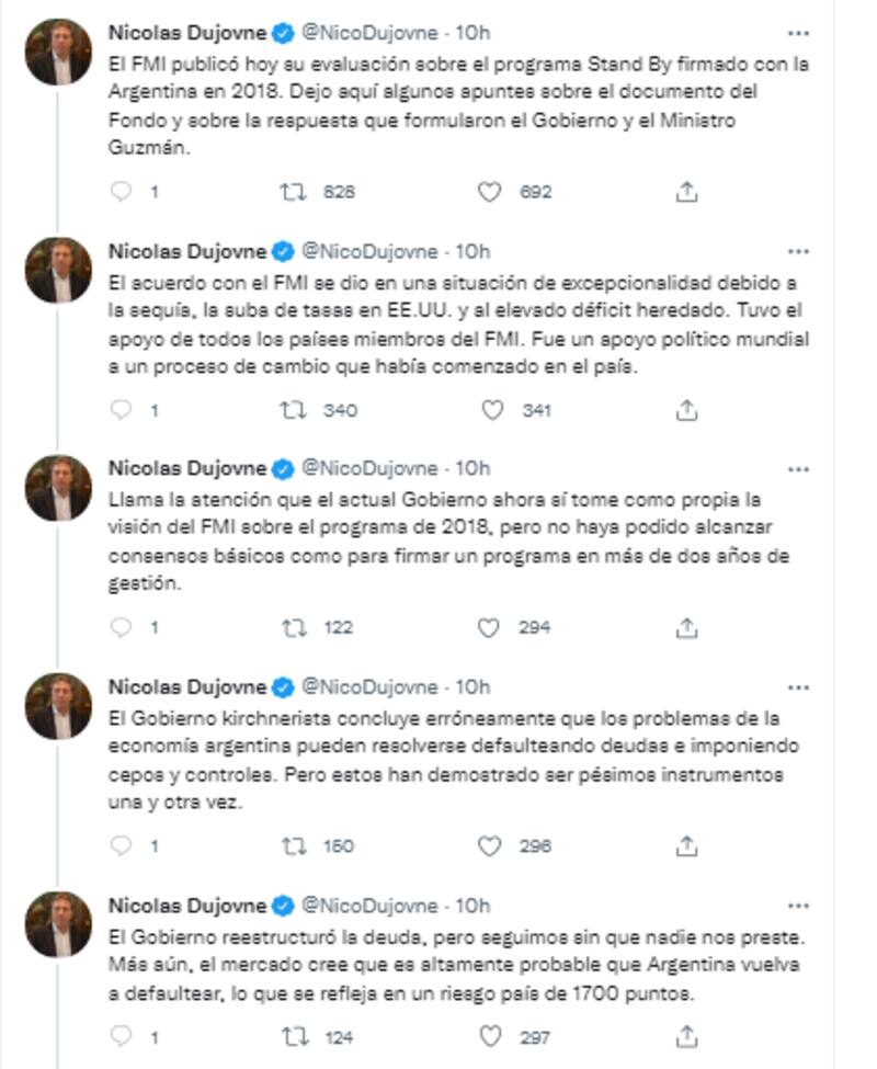 Nicolás Dujovne eligió esquivar toda autocrítica y apuntar contra el Gobierno actual. "El gobierno kirchnerista concluye erróneamente que los problemas de la economía argentina pueden resolverse defaulteando deudas e imponiendo cepos y controles. Pero estos han demostrado ser pésimos instrumentos una y otra vez".