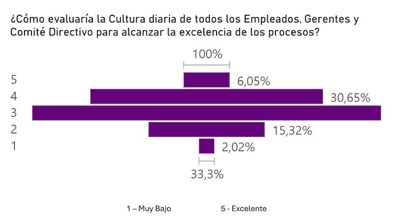 Uno de los datos más reveladores del estudio es la inconsistencia en la autoevaluación. Más del 50% de las empresas declara estar en niveles altos de madurez operativa (niveles 3, 4 o 5). Sin embargo, al analizar sus procesos diarios, la evidencia muestra que la mayoría no aplica herramientas básicas para el cambio cultural.