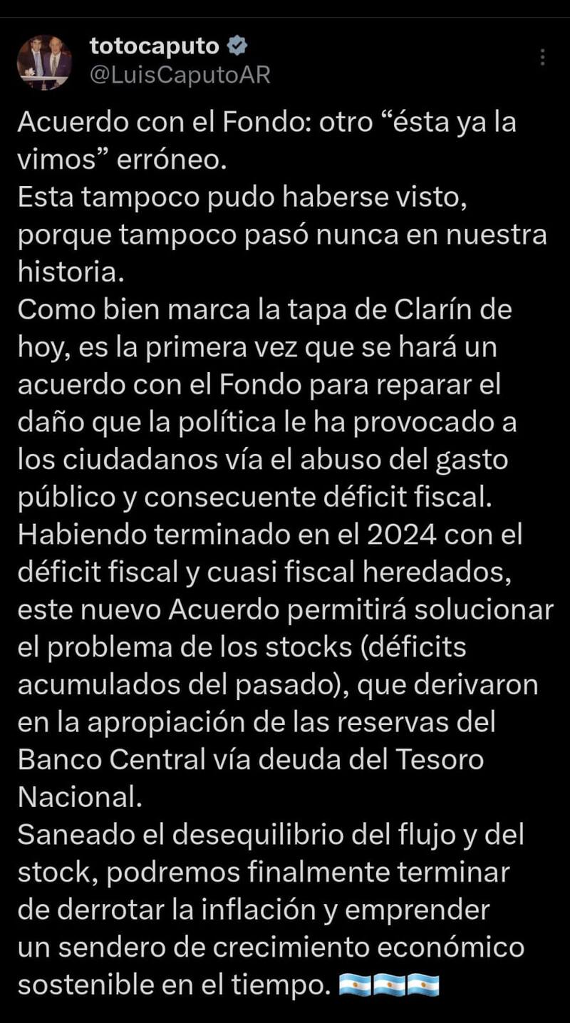 El ministro de Economía, Luis Caputo, explicó que el acuerdo con el FMI, del cual se publicó esta mañana el DNU, es algo que no pasó "nunca en nuestra historia".
