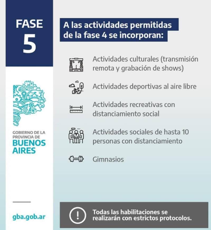 De acuerdo con la disposición del gobierno provincial, los 38 municipios restantes del interior bonaerense se encuentran en fase 5 debido a que no registran casos de coronavirus en los últimos 21 días.