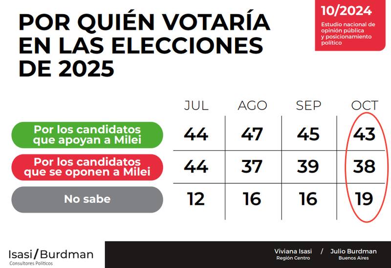 Cuando se consulta a quién votaría en las elecciones legislativas de 2025, el 43% se inclina por los candidatos que apoyan a Milei. Mientras que el 38% lo hace por los candidatos que se oponen al jefe de Estado.