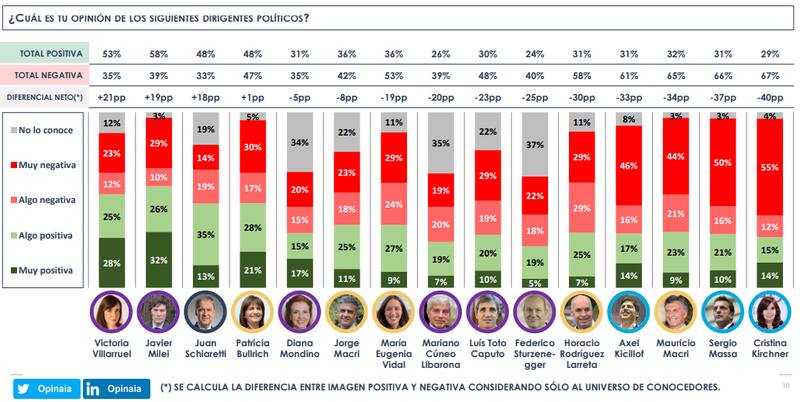 En el otro extremo, en cambio, se ubica la dos veces Presidenta Cristina Kirchner, quien cosechó un 67% de imagen negativa y apenas un 29% de imagen positiva. También en la tabla se ubica el exministro de Economía y rival de Milei en el balotaje del 19 de noviembre, Sergio Massa. El líder del Frente Renovador reunió un 66% de imagen negativa y 31% de positiva.