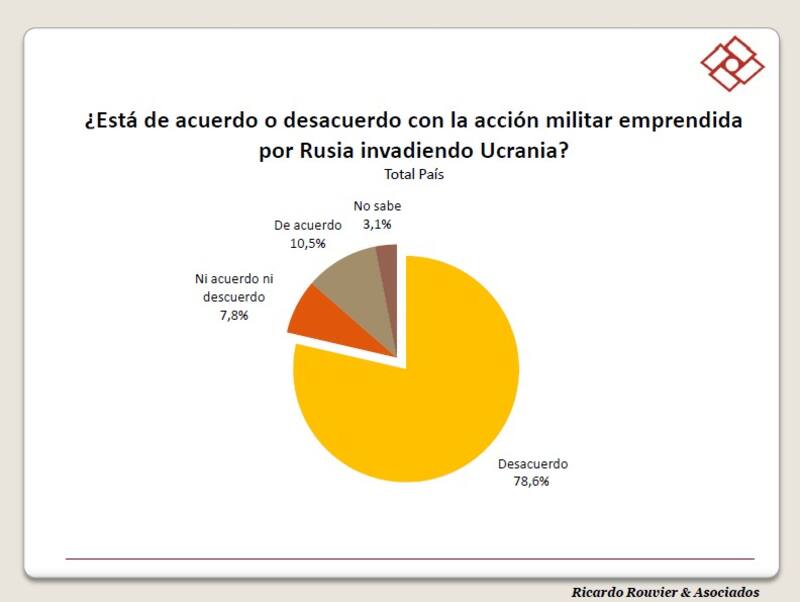 En el ámbito internacional se preguntó la opinión sobre la invasión rusa a Ucrania. En este punto, el 79% dijo estar en desacuerdo, pero uno de cada diez se mostró de acuerdo con la escalada de Moscú en Kiev. Otro 8% dijo estar "ni de acuerdo ni en desacuerdo" con la actual guerra que se libra en Europa del Este.