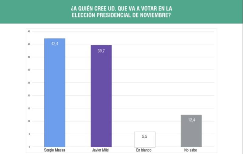 Acorde al relevamiento, Sergio Massa encabeza la preferencia de voto por apenas 2,7% de los votos. En el promedio general, sin entrar en el desagregado por categorías, el candidato oficialista concentra el 42,4% de la intención de voto para el balotaje mientras que 39,7% de las personas consultadas afirma que votaría al economista libertario.