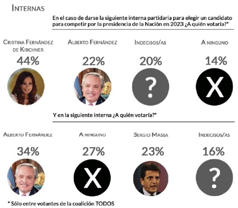 De vuelta en el Frente de Todos, Cristina Kirchner duplica al Presidente en el escenario de una primaria entre ambos entre votantes de ese sector político (44 a 22%). Pero si el rival de Fernández fuese Sergio Massa le podría ir mejor, ya que lo supera con un 34% de intención de voto contra un 23%.