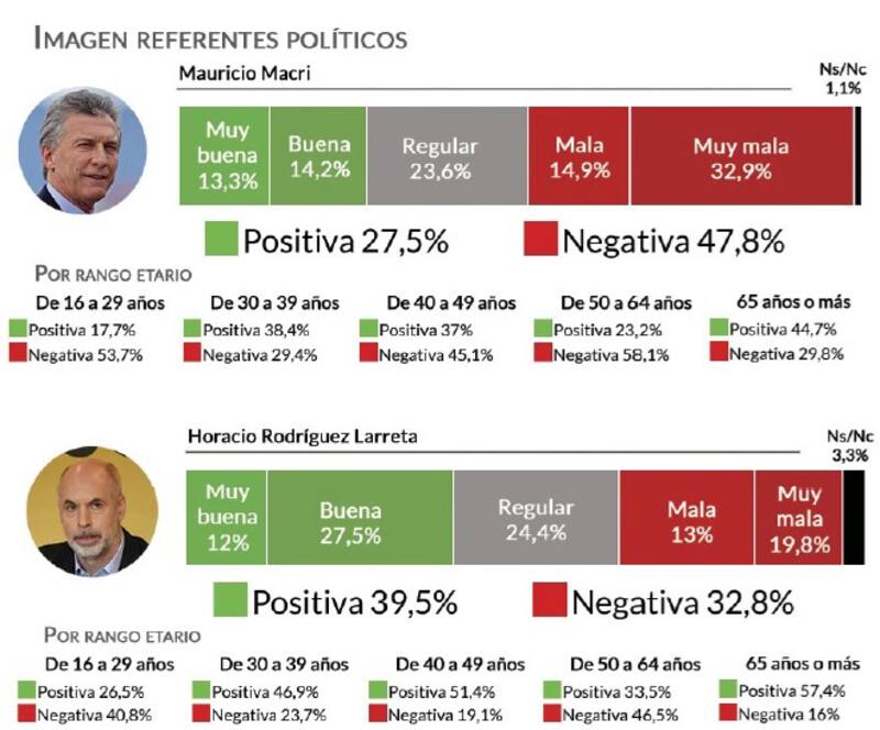 Del lado opositor, en cambio, se vislumbran realidades diferentes. Mauricio Macri tiene más de 20 puntos de imagen negativa más que de imagen positiva. En cambio, Horacio Rodríguez Larreta se ubica con un diferencial favorable, ya que tiene un 39% positivo y un 33% negativo.