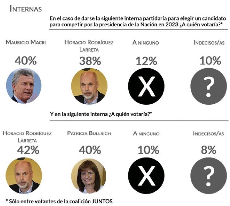 Sin embargo, si se consulta entre los votantes de Juntos por el Cambio, el ex presidente obtiene una leve ventaja en una eventual interna presidencial ante el jefe de gobierno (40 a 38%). En cambio, si la competencia interna para Rodríguez Larreta fuese Patricia Bullrich, ahí tendría una luz de ventaja (42 a 40%).