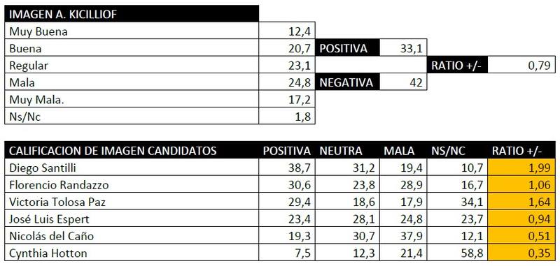 En cuanto a los candidatos a diputados nacionales, Diego Santilli es el que mejor diferencial tiene, con 20 puntos más de imagen positiva que negativa. Victoria Tolosa Paz también tiene números positivos (+12), lo mismo que Florencio Randazzo (+2).
