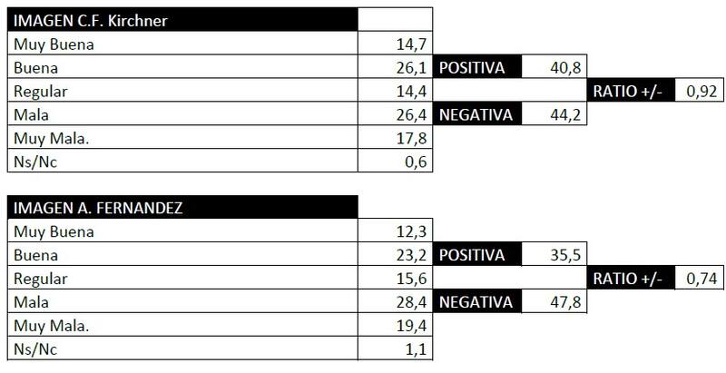 En primer lugar, consulta sobre la imagen de varios de los principales dirigentes políticos del país. En cuanto a la fórmula presidencial, Cristina Kirchner tiene mejores números que Alberto Fernández. La vicepresidenta tiene 41 puntos de imagen positiva y 44 de negativa, mientras que el jefe de Estado cuenta con 35 puntos positivos y 48 negativos.