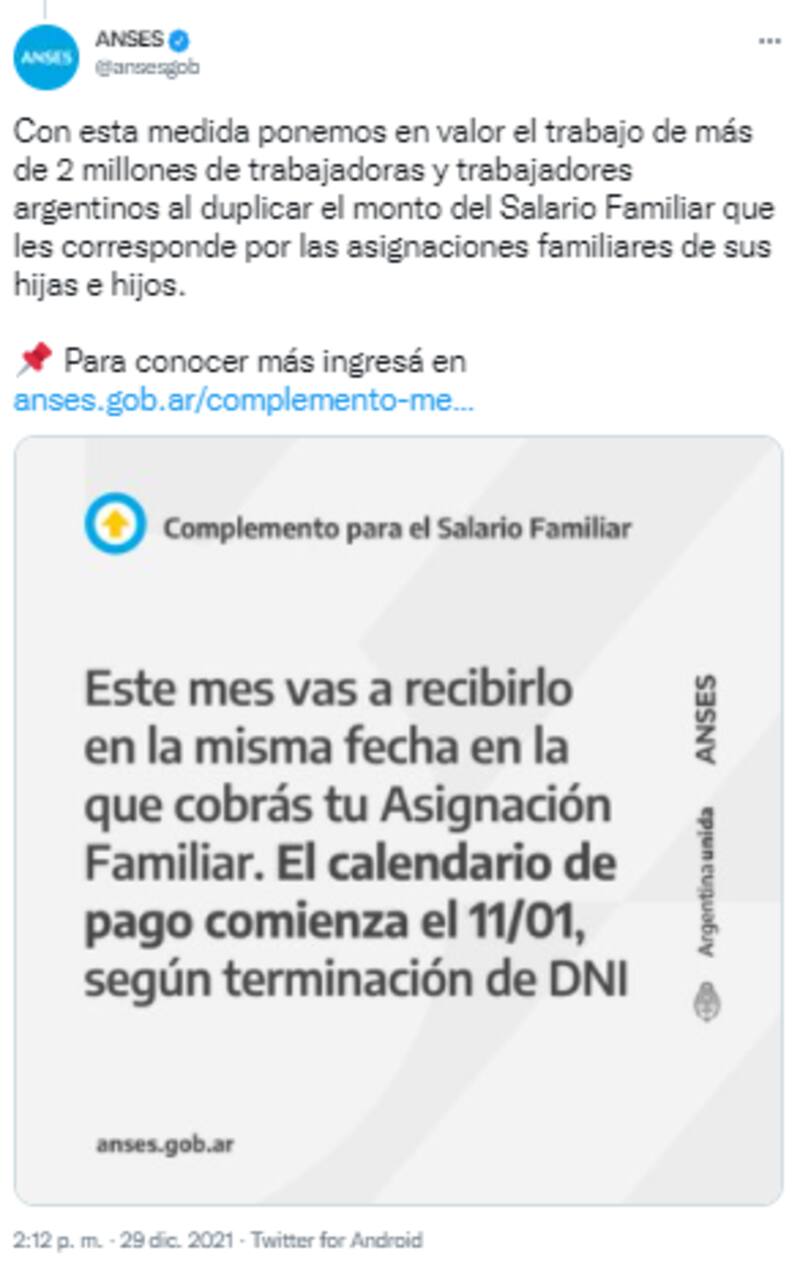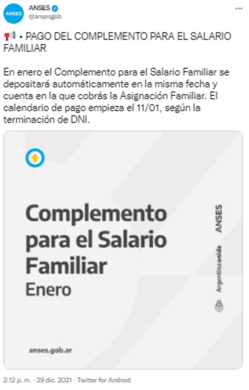 "En enero el Complemento para el Salario Familiar se depositará automáticamente en la misma fecha y cuenta en la que cobrás la Asignación Familiar. El calendario de pago empieza el 11/01, según la terminación de DNI", anunció ANSES en redes sociales.