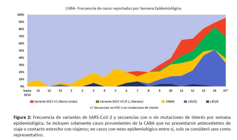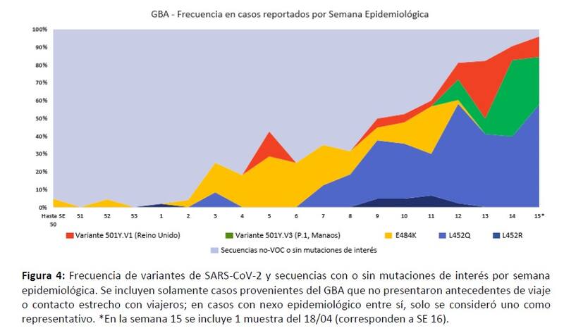 Dentro del informe, se dividen los resultados entre la ciudad de Buenos Aires y el conurbano bonaerense, aunque las conclusiones están en la misma línea. Se analiza el incremento de las distintas cepas según la semana epidemiológica. A partir de febrero, en la semana 9, se observó un decrecimiento de la secuencia que no mostraba mutaciones hasta la última, que es la semana 15, la que llegó hasta el 18 de abril.