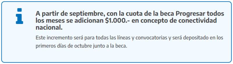 A partir de septiembre, el Ministerio de Educación y ANSeS suman a la cuota mensual de la Becas Progresar, un bono adicional de $1000 en concepto de conectividad nacional.