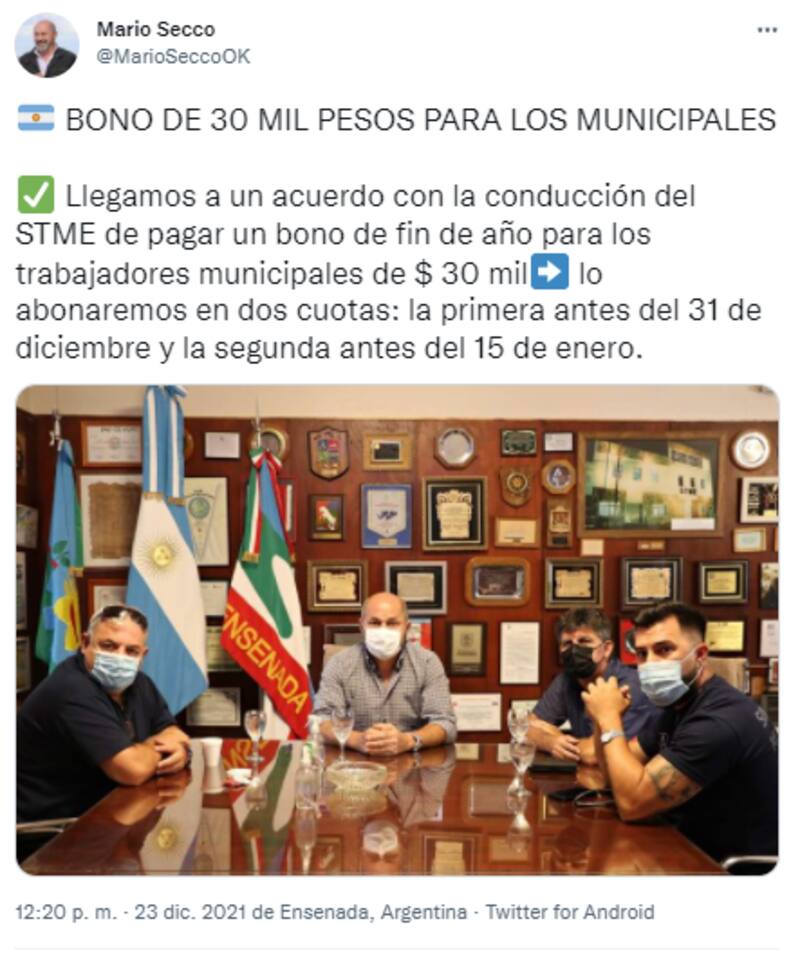 El intendente de Ensenada, Mario Secco, confirmó el pago de un bono de fin de año de $ 30.000 para los trabajadores del municipio que gobierna. La suma extraordinaria se liquidará en dos cuotas: la primera antes del 31 de diciembre y la segunda antes del 15 de enero.