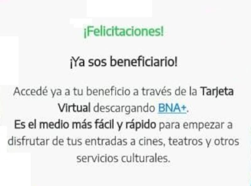 "¡Ya sos beneficiario! Accedé ya a tu beneficio a través de la Tarjeta Virtual descargando BNA+. Es el medio más fácil y rápido para empezar a disfrutar de tus entradas a cines, teatros y otros servicios culturales", señala la notificación enviada por el organismo previsional a las y los solicitantes que cumplieron con los requisitos.