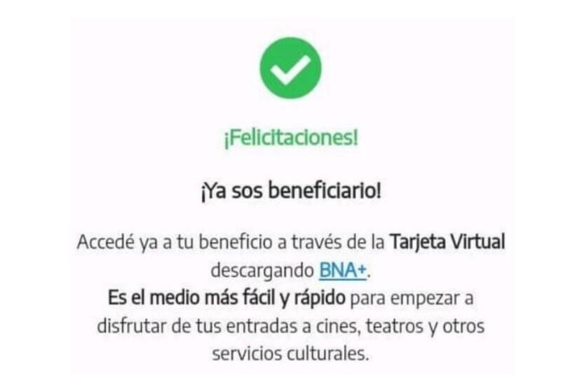 "Felicitaciones. Ya sos beneficiario. Accedé ya a tu beneficio a través de la Tarjeta Virtual descargando BNA+", indica la última actualización de ANSES.