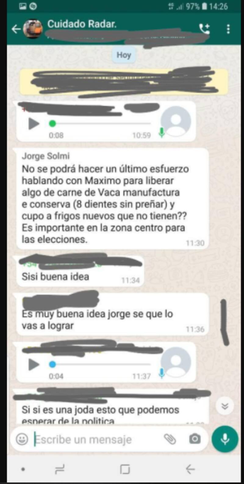 "Del modo más absurdo, con un mensaje de WhatsApp enviado por error a un grupo de productores, el secretario de Agricultura, Jorge Solmi, confirmó que es casi un hecho la continuidad del cepo a la carne. Y lo que es peor: dio a entender que no es decisión de ningún funcionario del Poder Ejecutivo sino de Máximo Kirchner, el diputado e hijo de la vicepresidenta Cristina Kirchner".