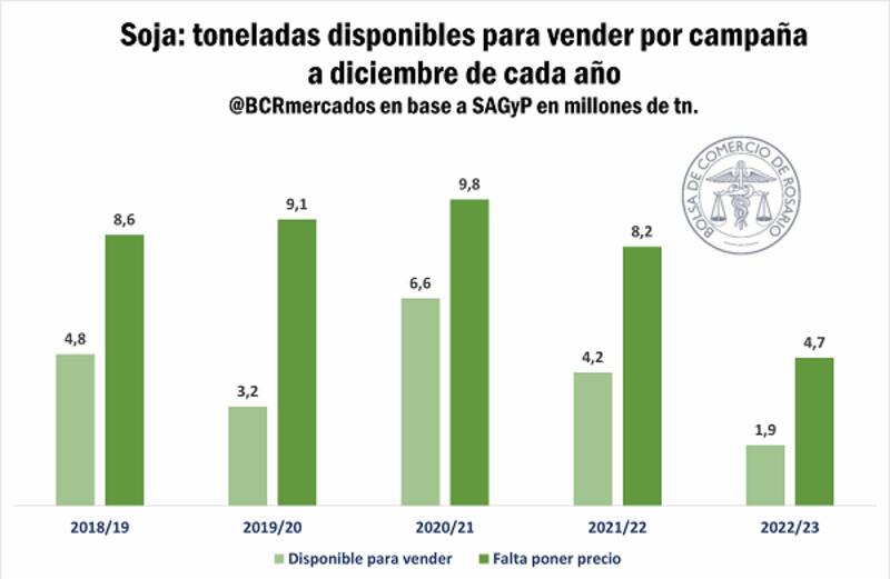 Teniendo en cuenta que a la última semana de noviembre la comercialización asciende a 16,5 Mt, más lo que se utilice como semillas y otros fines, las toneladas disponibles para comprometer, de aquí a la incursión del nuevo ciclo, es de 1,9 Mt, cuando en promedio, para los últimos cuatro meses de campaña, aún quedaban disponibles para vender casi 5 Mt.