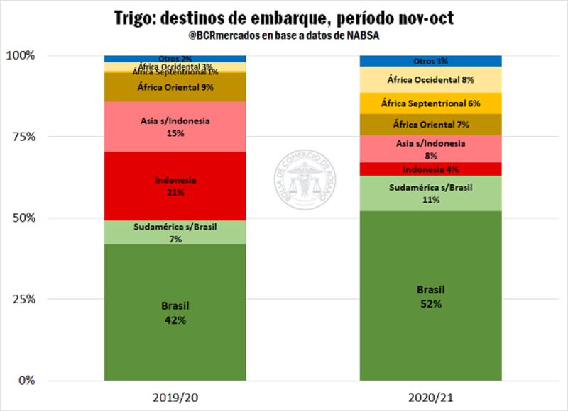 Brasil es históricamente el principal comprador de trigo argentino. En la última campaña 2020/21 aumentó sus importaciones desde nuestro país en 300.000 toneladas. De esa manera, el mercado carioca absorbió más de la mitad del trigo que exportó Argentina, de acuerdo al último informe de la BCR.