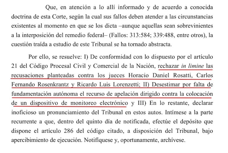 Rosatti, Rosenkrantz y Lorenzetti afirmaron además que, en lo referido al monitoreo electrónico, el recurso presentado “carece de fundamentación autónoma”. El fallo remarcó que, para este tipo de presentaciones, resulta exigible rebatir “todos y cada uno de los argumentos” en los que se apoyaron las decisiones cuestionadas.