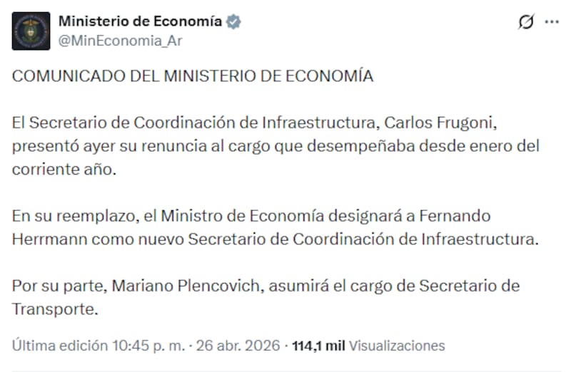 El Poder Ejecutivo oficializó este martes la renuncia de Carlos Frugoni al cargo de Secretario de Coordinación de Infraestructura mediante el Decreto 286/2026 publicado en el Boletín Oficial, en el que también se formalizó la designación de su sucesor.