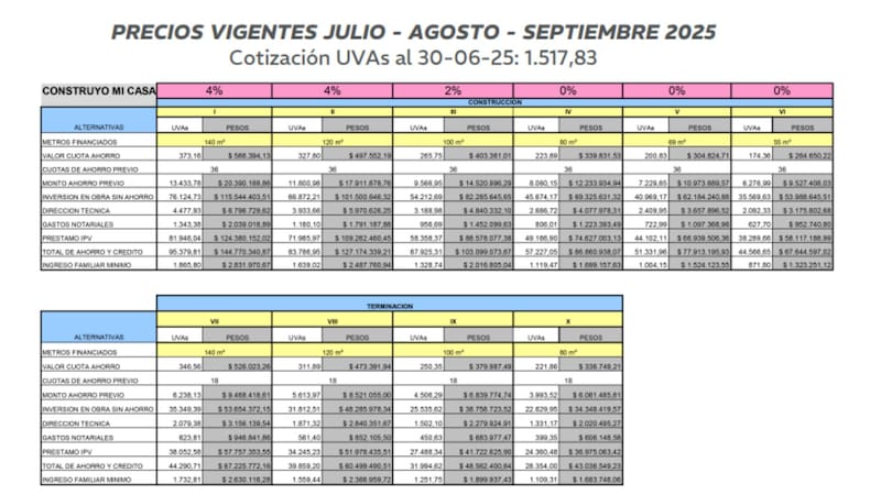Para la construcción de la obra hay alternativas disponibles de 140 m2, 120 m2, 100 m2, 80 m2, 69 m2 o 55 m2. En el caso de la finalización (debe tener un avance de 55% a 65%) las opciones son 140 m2, 120 m2, 100 m2 o 80 m2.