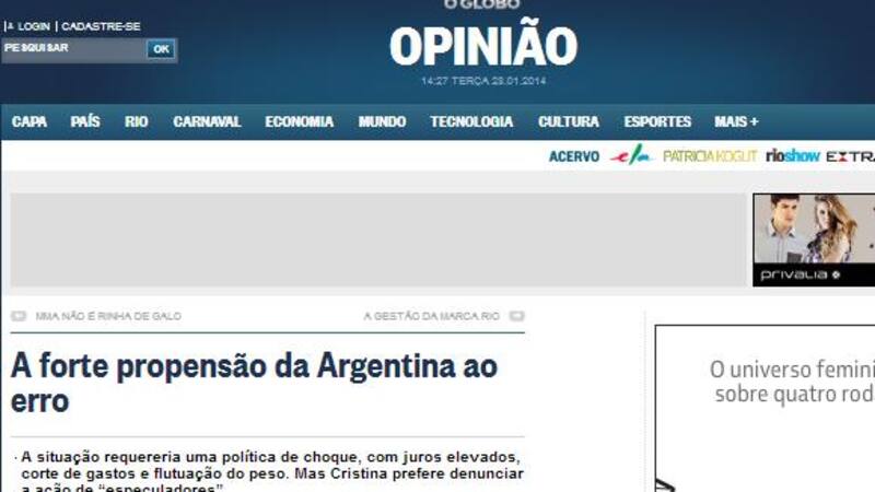 El periódico brasileño O’Globo publicó hoy un crítico editorial titulado "La fuerte propensión de la Argentina al error", en el que describe una preocupante visión sobre la actualidad que atraviesa el país y critica en duros términos los lineamientos “populistas” de la administración de Cristina Kirchner.