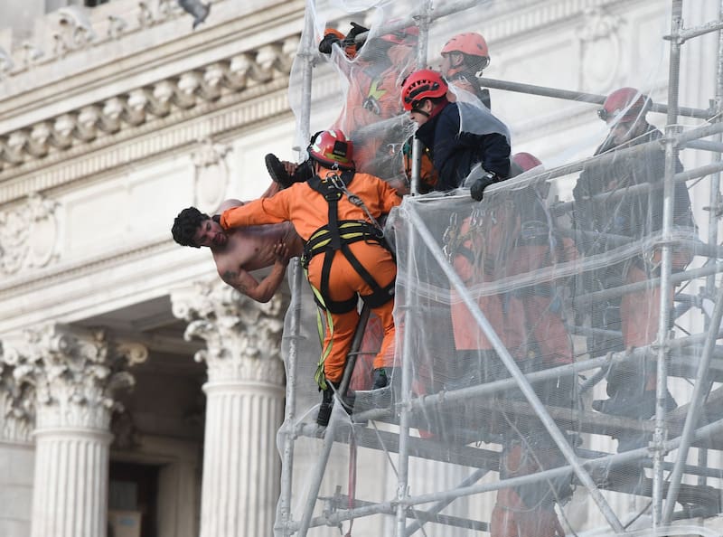 Todo comenzó cerca de las 7 de la mañana: el hombre, en estado alterado, se subió a una estructura metálica que se encuentra instalada para mantenimiento de uno de los monumentos en la puerta del palacio legislativo.