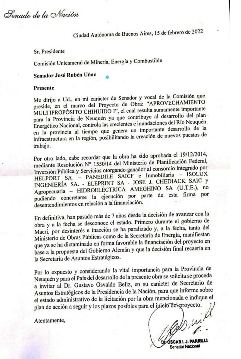 Parrilli también pide información sobre los procesos de licitación y ejecución de otras obras que implican algún tipo de acuerdo con China. Entre ellas, las represas Néstor Kirchner, Jorge Cepernic y Chihuido I, así como también el Proyecto AMBA y la Central Térmica Manuel Belgrano II.