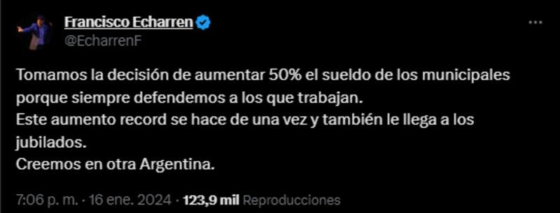El intendente de Castelli, Francisco Echarren, reiteró en sus redes sociales que los trabajadores municipales recibirán un aumento del 50% en sus salarios.