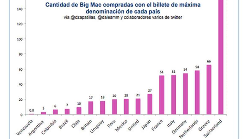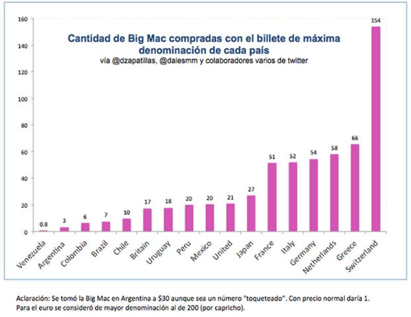 El peso argentino sólo supera al bolívar venezolano, cuyo billete más alto sirve para pagar apenas cuatro quintas partes de la hamburguesa de McDonalds. En Colombia, por ejemplo, se pueden comprar seis Big Mac con un billete; en Brasil, 7; en Chile, 10; en Uruguay, 18; y en México y Perú, 20.