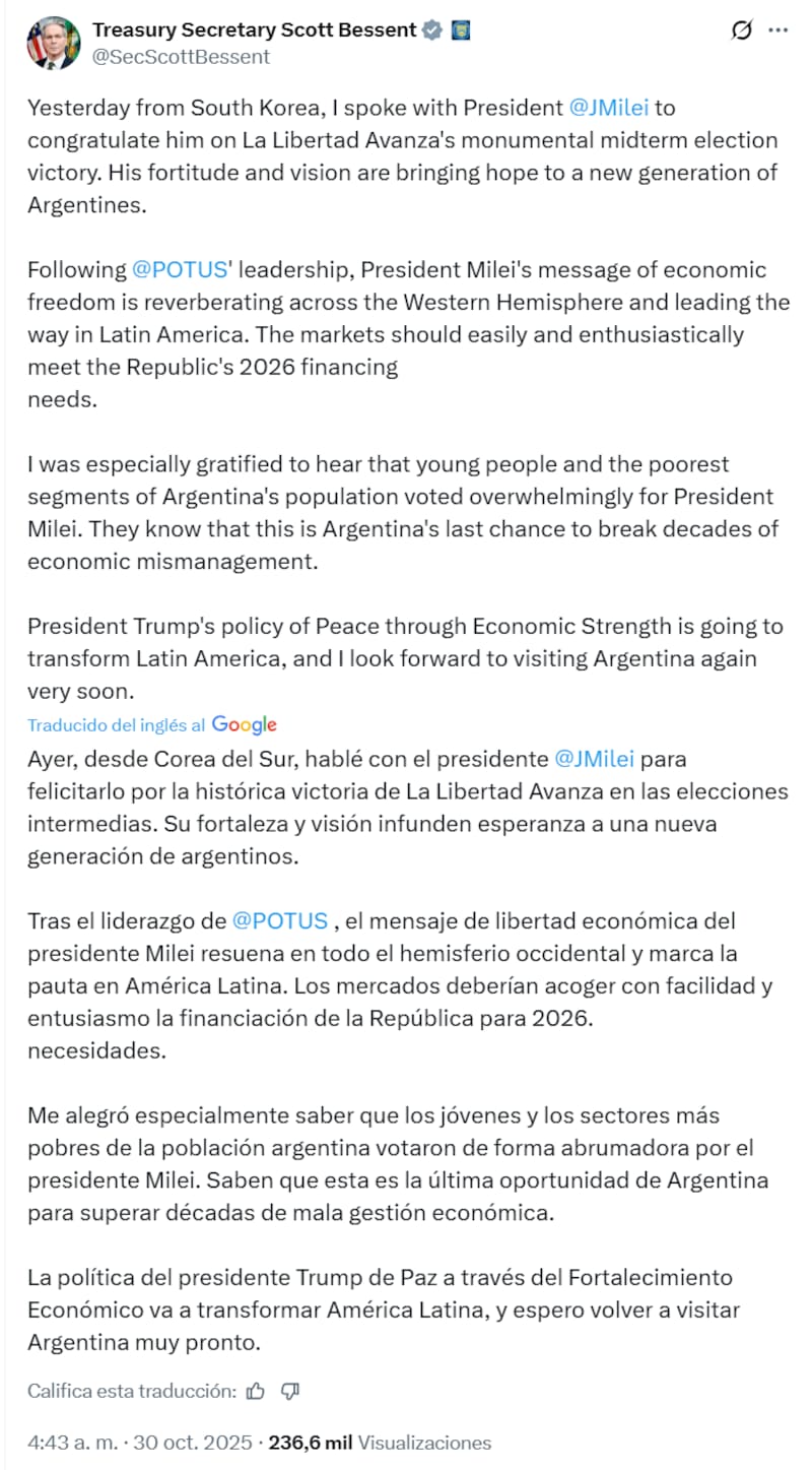 Scott Bessent volvió a respaldar a Javier Milei. Como en anteriores ocasiones, lo hizo en la previa de la apertura de las operaciones bursátiles, desde Corea del Sur, donde se encuentra de visita.