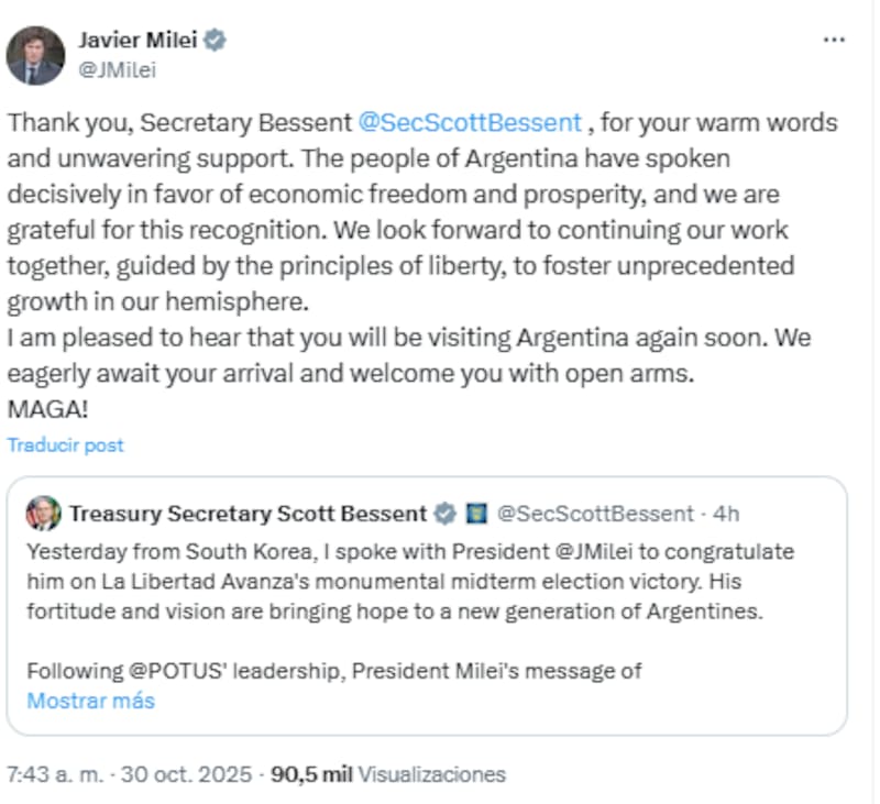 "Gracias, secretario Bessent por sus amables palabras y su apoyo incondicional", contestó Milei, quien agregó: "El pueblo argentino se ha manifestado con contundencia a favor de la libertad económica y la prosperidad, y agradecemos este reconocimiento. Esperamos continuar trabajando juntos, guiados por los principios de la libertad, para impulsar un crecimiento sin precedentes en nuestro hemisferio".