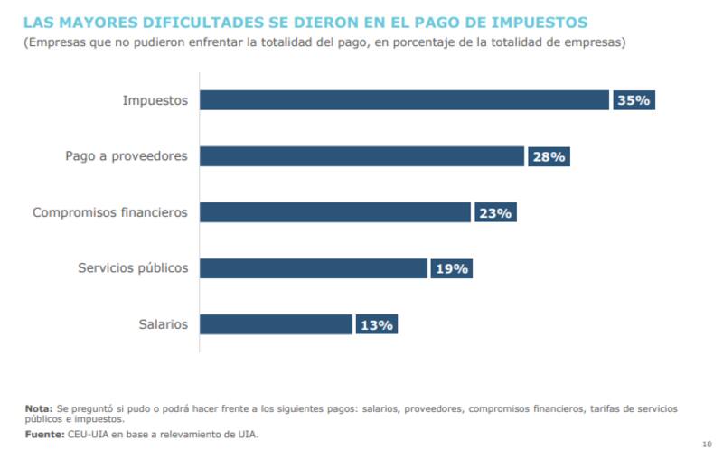 Pero no fueron las mismas en todos los rubros. El ranking lo encabezó "Impuestos" donde el 35% de las empresas no pudieron enfrentar la totalidad del pago; seguido por "Proveedores" (28%); "Compromisos financieros" (23%); "Servicios públicos" (19%); y "Salarios" (13%).