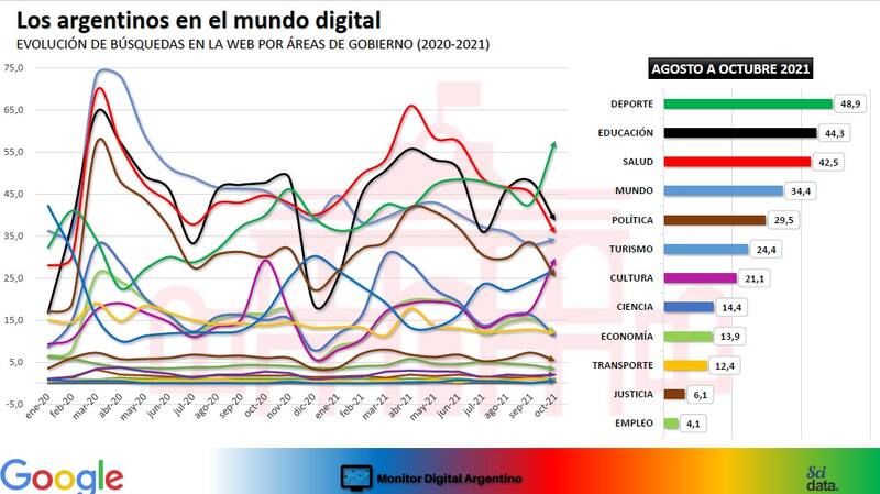 En cuanto a las búsquedas en Google de las áreas de gobierno, salud y educación muestran un retroceso en el último mes entre los temas más requeridos. A contramano, deporte se despega al tope de la lista. Cultura se destaca como uno de los mayores crecimientos, en línea con la apertura de actividades.