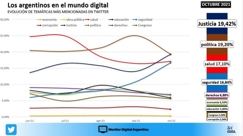 En primer lugar, el estudio muestra la evolución de las temáticas más mencionadas en Twitter, red social en la que se suelen tratar cuestiones de actualidad. Sobre este tema, la justicia pica en punta, en línea con la citación a indagatoria a Mauricio Macri. Muy cerca quedan los temas de política, en retroceso luego de la campaña y las elecciones primarias.