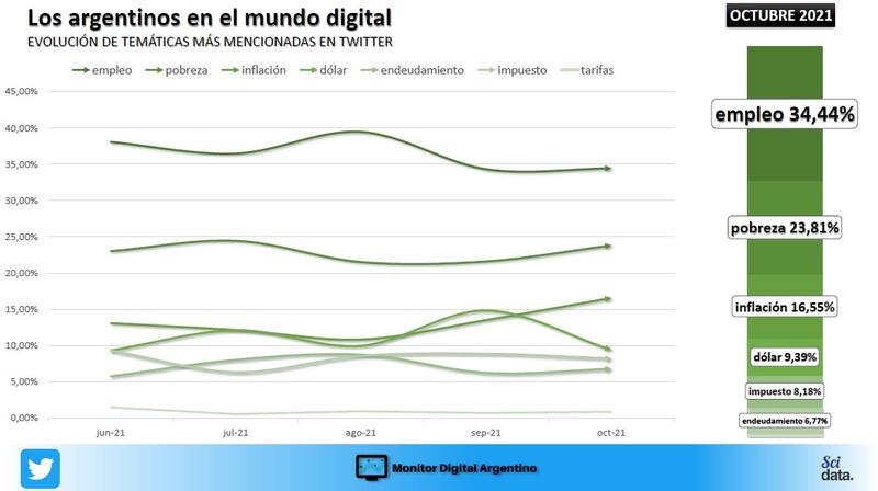 Sobre este tema, pero en Twitter, la información va en la misma línea: el empleo es el tema más mencionado, con un tercio del total. Le siguen la pobreza, la inflación y el dólar.