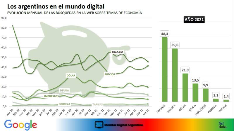También en cuanto a las búsquedas en Google, pero en temas económicos, el trabajo es lo más relevante, seguido por los precios. Más atrás se encuentra el dólar, otro de los temas que históricamente suele aparecer.