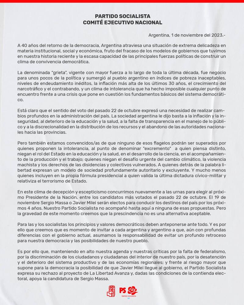 Por eso es tan fuerte el pedido del Partido Socialista que integra Paulón y que preside Mónica Fein. No solo no son neutrales sino que piden expresamente el voto a favor de Massa con advertencias sobre el riesgo que para la democracia representa Milei. "Ante la gravedad de este momento creemos que la prescindencia no es una alternativa aceptable", acordaron en un documento aprobado por el partido.