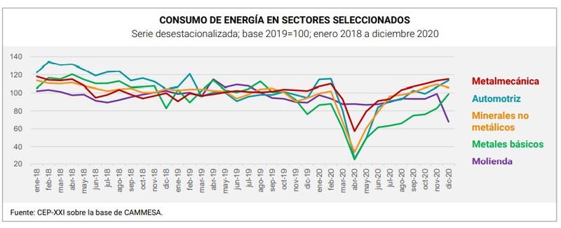 Con todo, el informe del CEP destaca el buen cierre del año en sectores como la industria automotriz, con un diciembre que arrojó un crecimiento del 107,7% frente al mismo mes del año anterior, y la metalmecánica, con un avance del consumo de energía eléctrica del 13% interanual.