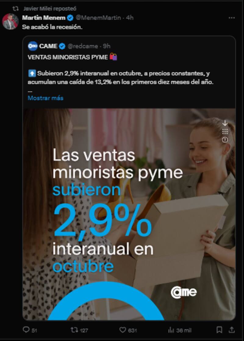 Para el Gobierno "se acabó la recesión" económica, así lo indicó el presidente de la Cámara de Diputados, Martín Menem, este domingo tras conocer el último informe sobre las ventas minoristas pyme que elaboró la Cámara Argentina de la Mediana Empresa (CAME).