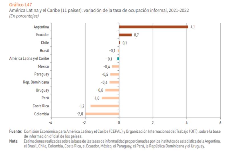 La tasa de ocupación informal promedio de la región se mantuvo en torno al 48%: en 2021 fue del 48,3% y en 2022 se redujo ligeramente y se situó en el 48,2%.