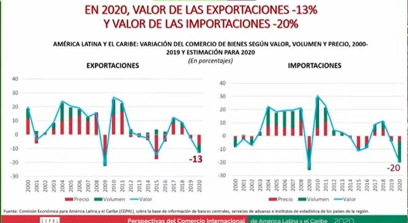 En este contexto, se observó un desplome de las importaciones de los países del área, que llegó al 20% en 2020, según estimó el organismo en el documento presentado en conferencia de prensa por Bárcena.
