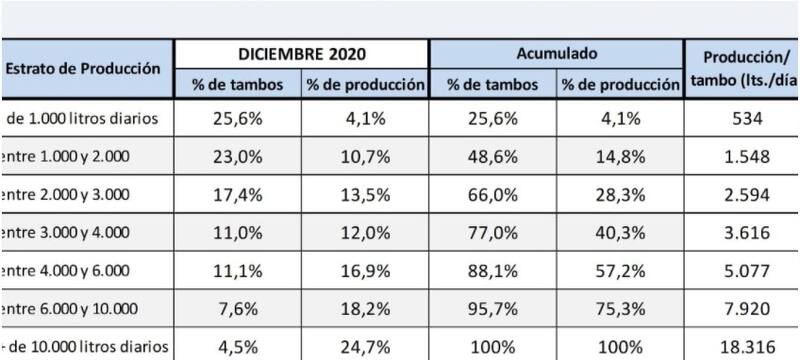 Según estimaciones del Observatorio de la Cadena Láctea Argentina (OCLA) el 66% de los tambos produce menos de 3000 litros diarios de leche y explica el 28,3% de la producción (datos de diciembre de 2020).