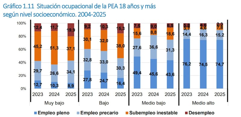 Agregaron que la pobreza estructural, la informalidad y precariedad laboral permanecen en niveles históricamente altos y con un 30% de la población en condiciones crónicas de vulnerabilidad. No ven en el régimen económico actual y los sectores ponderados, como el agro y minero, factores que asistan a la salida de la informalidad, sino que profundizarían el autoempleo de subsistencia y la dependencia a la asistencia estatal.
