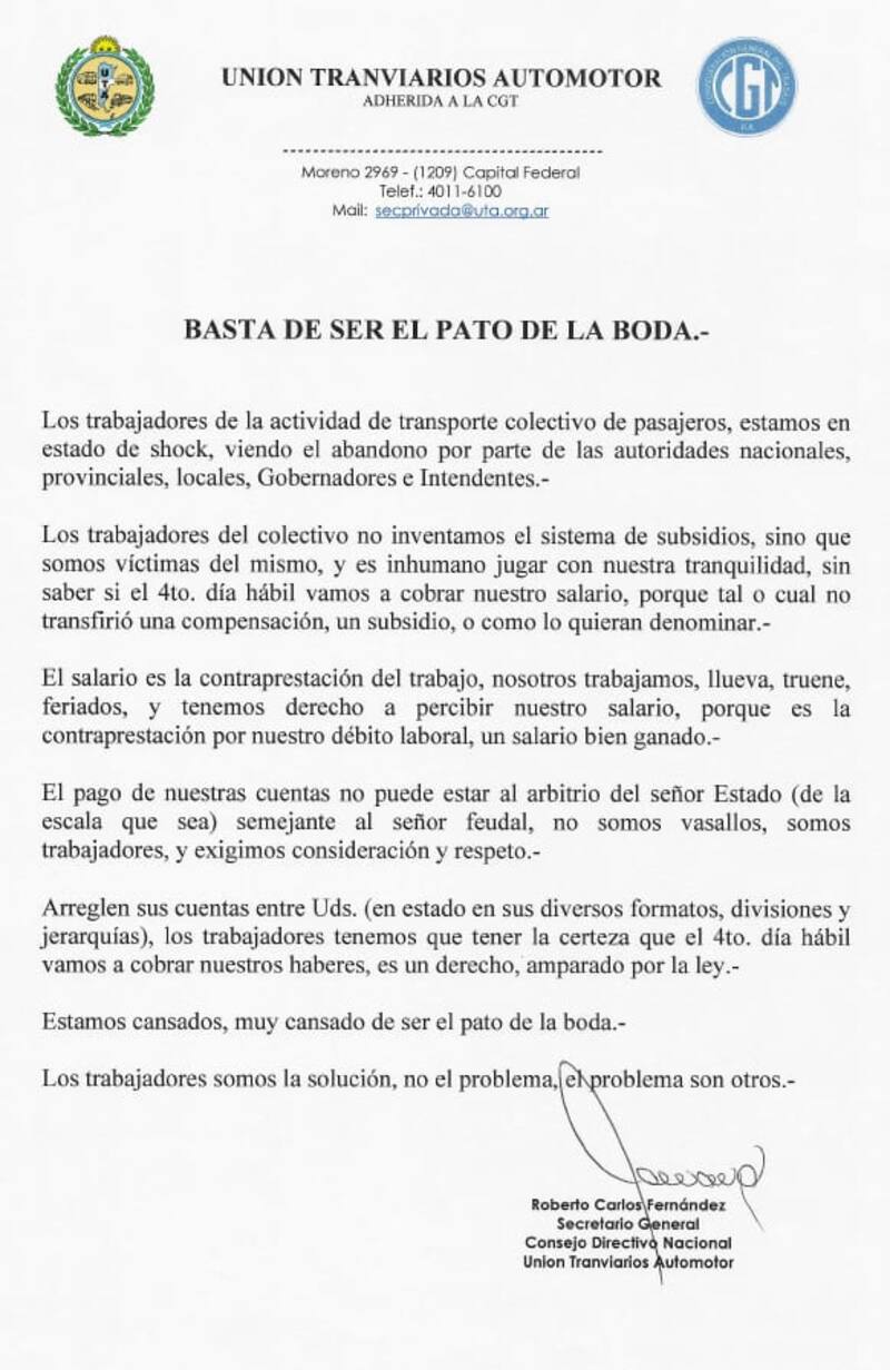 Según un comunicado emitido por el sindicato, los trabajadores del transporte colectivo de pasajeros "estamos en estado de shock, viendo el abandono por parte de las autoridades nacionales, provinciales, locales, Gobernadores e Intendentes".