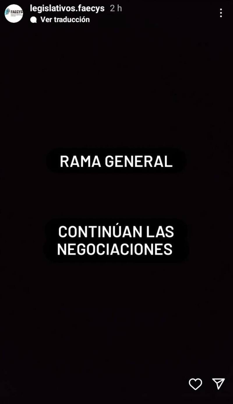"Rama general: continúan las negociaciones", puntualizó la Secretaría Asuntos Legislativos de la FAECyS en Instagram.