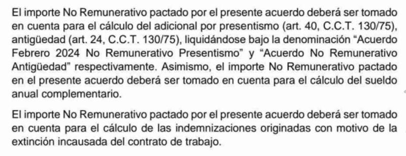"El importe No Remunerativo pactado por el presente acuerdo deberá ser tomado en cuenta para el cálculo del adicional por presentismo (art. 40, C.C.T. 130/75), antigüedad (art. 24, C.C.T. 130/75), liquidándose bajo la denominación 'Acuerdo Febrero 2024 No Remunerativo Presentismo' y 'Acuerdo No Remunerativo Antigüedad' respectivamente. Asimismo, el importe No Remunerativo pactado en el presente acuerdo deberá ser tomado en cuenta para el cálculo del sueldo anual complementario", detalló el entendimiento homologado por la Secretaría de Trabajo mediante la disposición 21/2024.