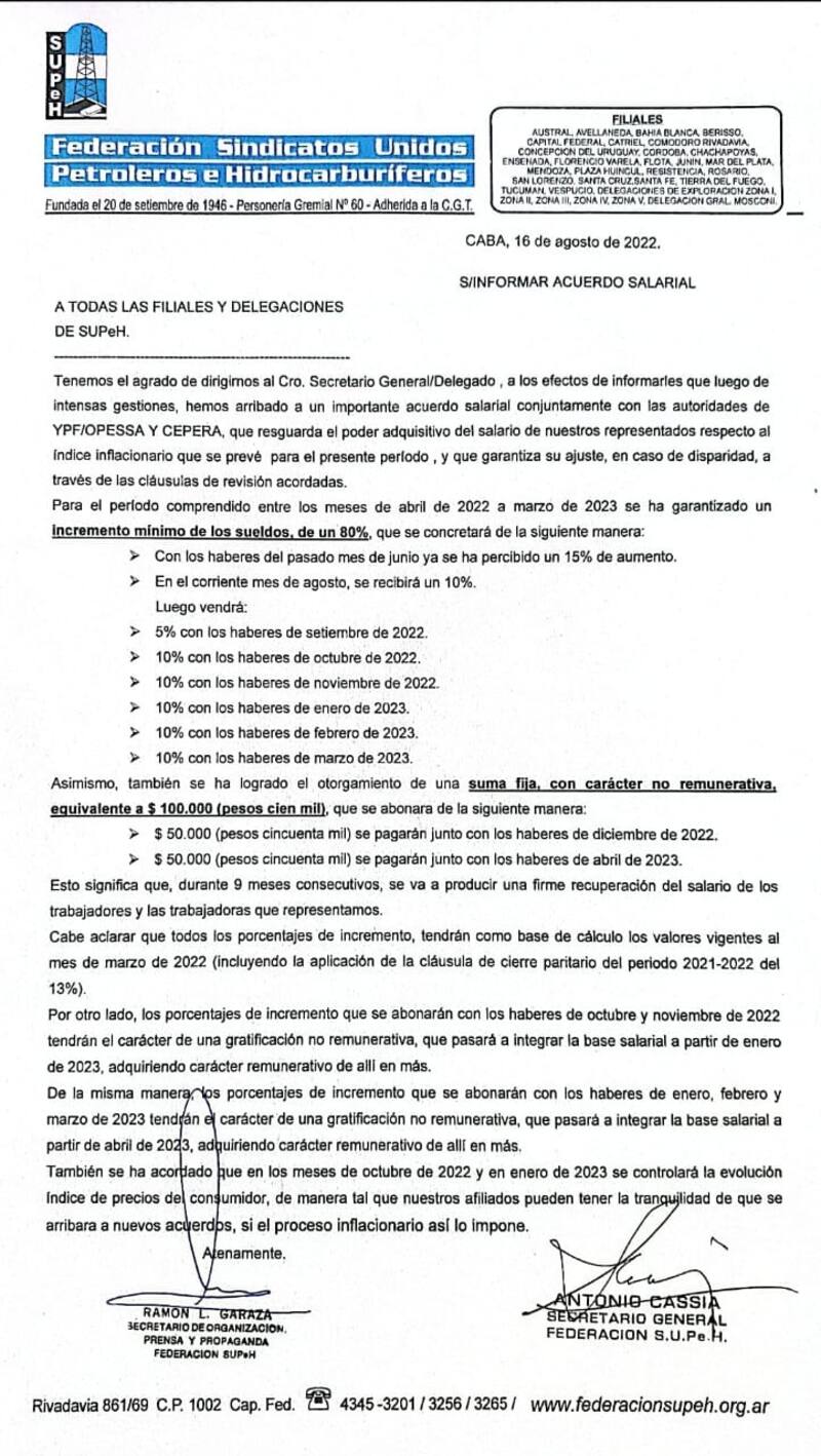 Fue el propio Cassia quien le anunció a los afiliados el tenor del acuerdo, en una video conferencia en la que Cassia se dirigió a ellos por streaming: en el encuentro virtual, el gremialista informó que a la suba porcentual se agrega suma fija equivalente a $ 100.000, que se abonará $ 50.000 junto con los haberes de diciembre y otros $ 50.000 en abril de 2023.